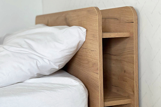 В изголовье кровати есть дополнительные полки- это места хранения под будильник, телефон, книги и другие приятные мелочи.