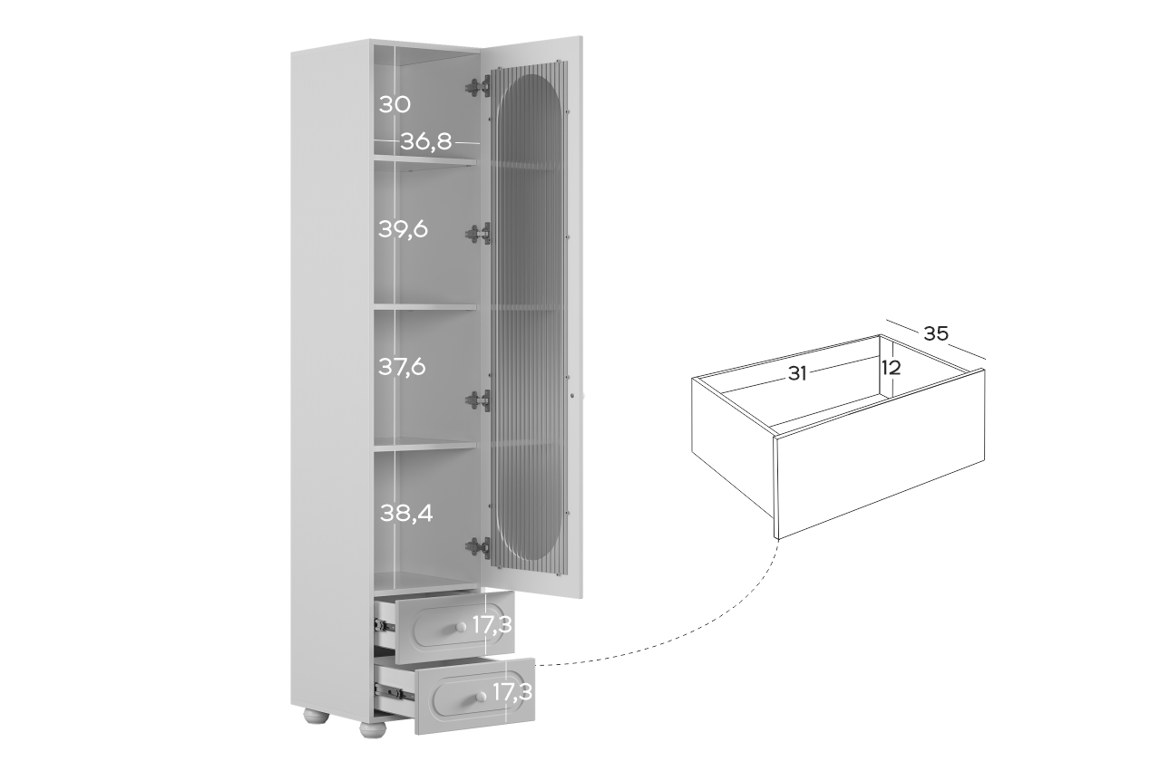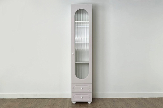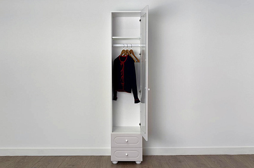 Модель оснащена одной распашной дверцей с вставкой из прозрачного рифлёного стекла, а также двумя вместительными выкатными ящиками в нижней части для хранения одежды, текстиля или аксессуаров. Внутреннее наполнение можно выбрать в зависимости от задач: шкаф комплектуется полками или штангой для плечиков, что позволяет адаптировать его под разные потребности.