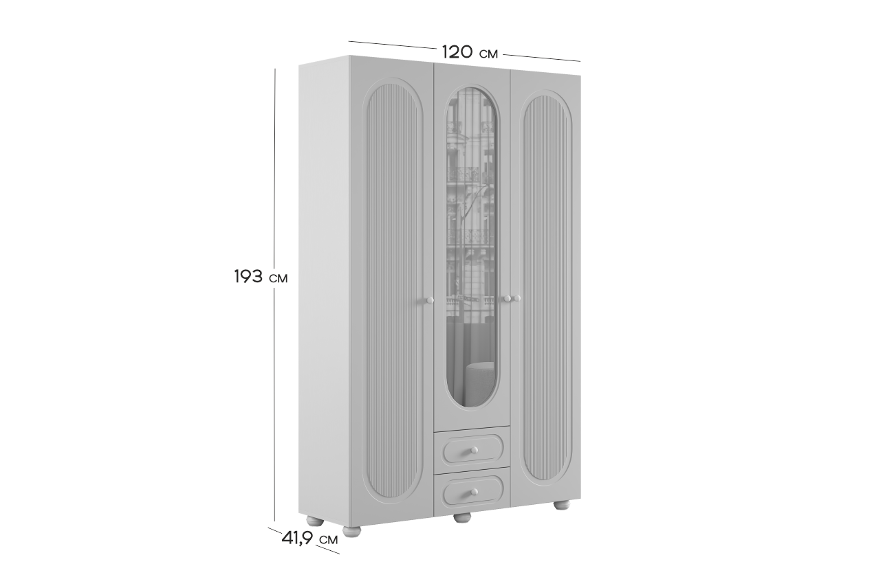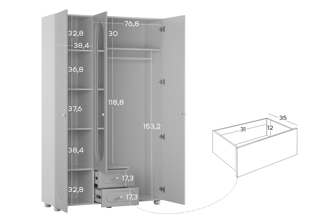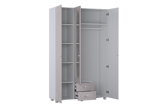 Шкаф оснащён тремя распашными дверями: две крайние двери выполнены из МДФ, а средняя дверь дополнена зеркалом, которое визуально расширяет пространство и делает комнату светлее. В нижней части предусмотрены два выкатных ящика, подходящих для хранения белья, аксессуаров или повседневных вещей.