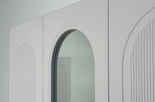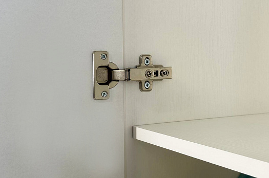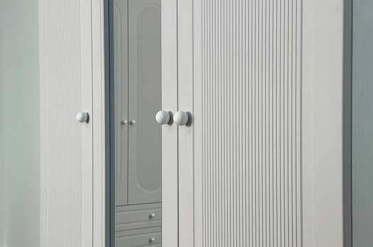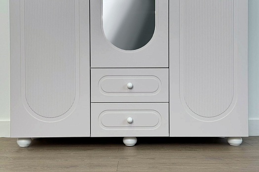 Корпус шкафа выполнен из ЛДСП толщиной 16 мм, фасады изготовлены из МДФ в плёнке ПВХ и декорированы фрезеровкой. Оригинальные круглые ручки и опоры подчёркивают стиль мебели и придают ей визуальную лёгкость.