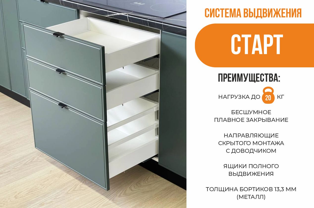 Состоит из: шкафа рабочего с тремя выкатными ящиками с системой выдвижения СТАРТ (встроенные доводчики, плавное бесшумное открывание и закрывание).