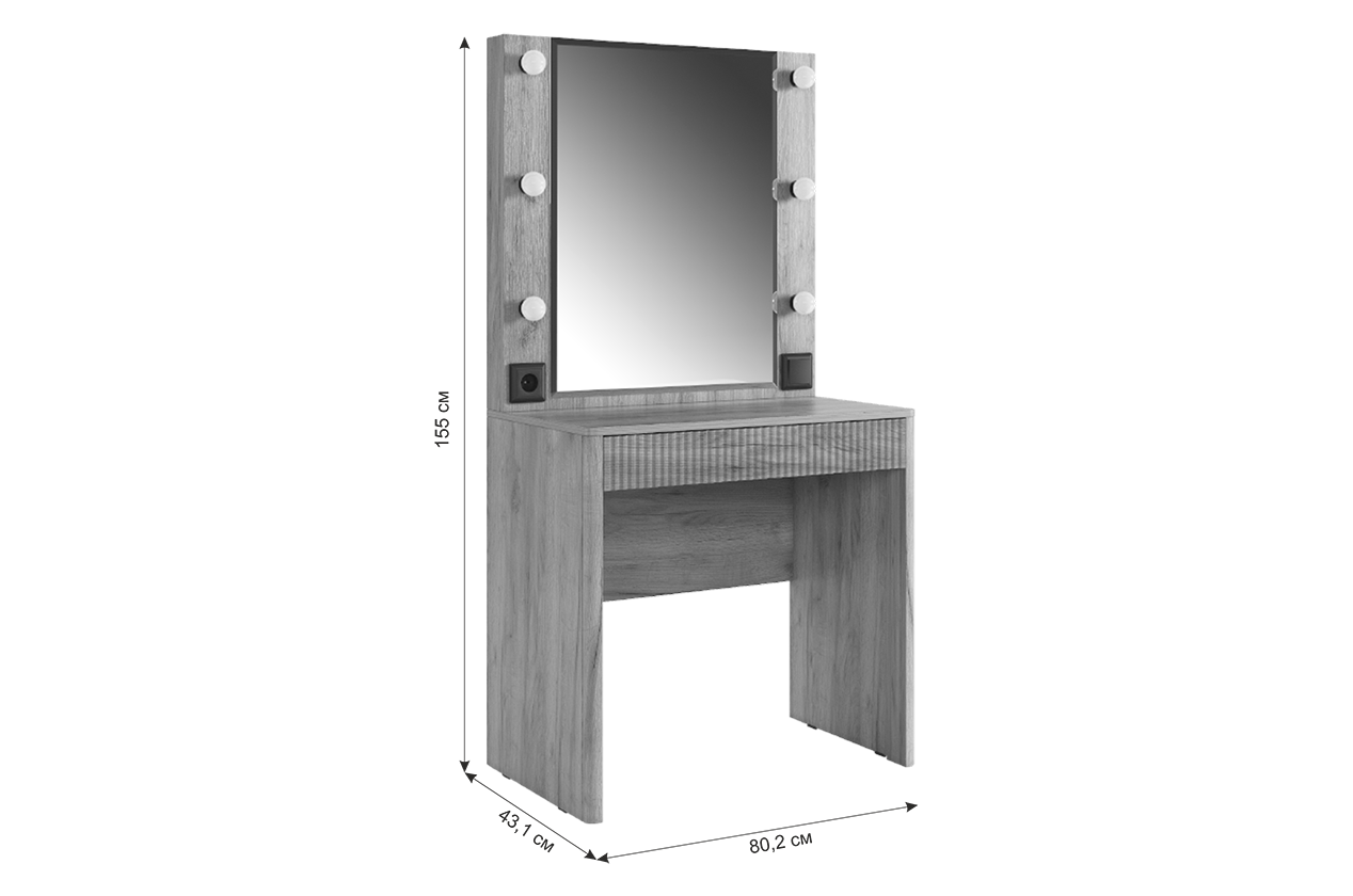 Трюмо Адам — это идеальное сочетание стиля и практичности. С широким фацетированным зеркалом, в котором встроена подсветка из 6 лампочек, оно создает атмосферу профессиональных студий визажистов прямо у вас дома. Комфорт и функциональность обеспечиваются дополнительными элементами, такими как выключатель, розетка для фена и выдвижной ящик для хранения украшений и косметики. Элегантные закругленные углы завершают дизайн, делая его идеальным дополнением к вашей спальне.
