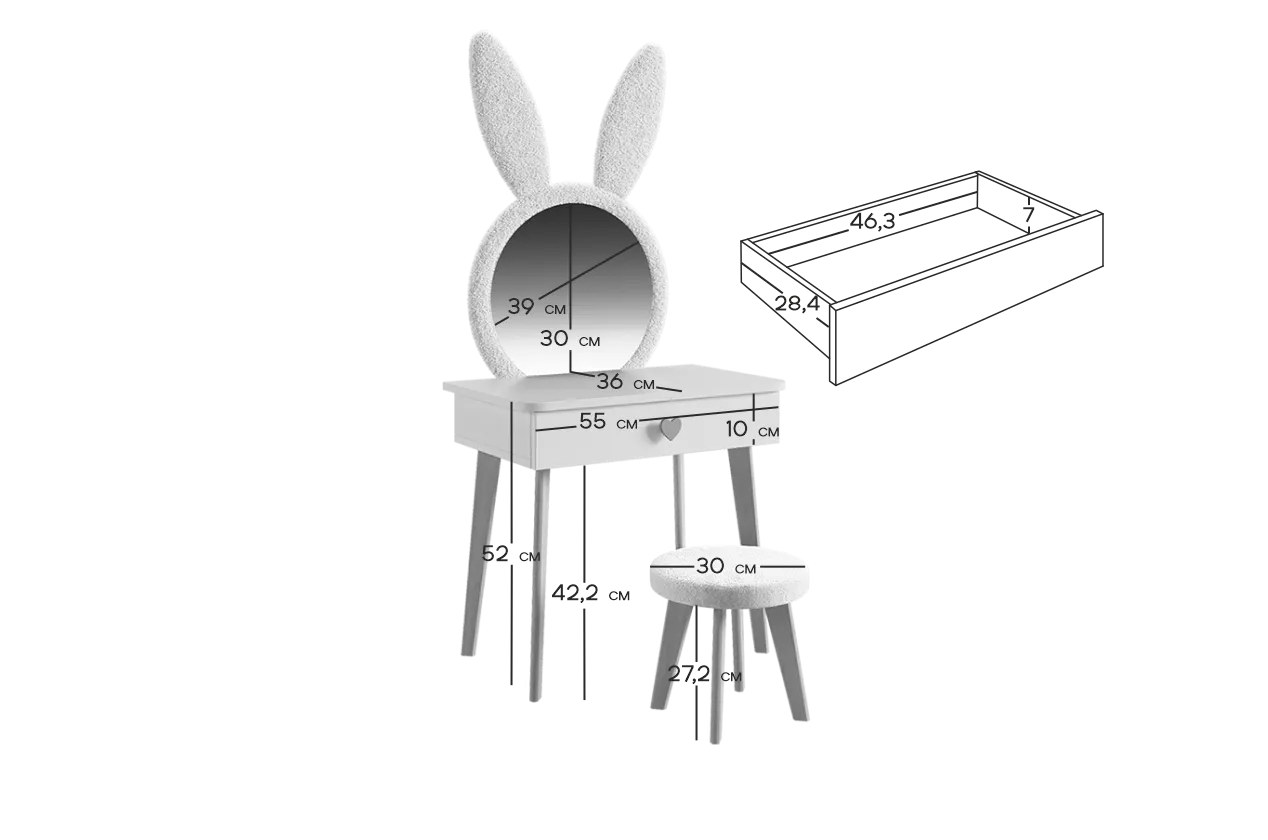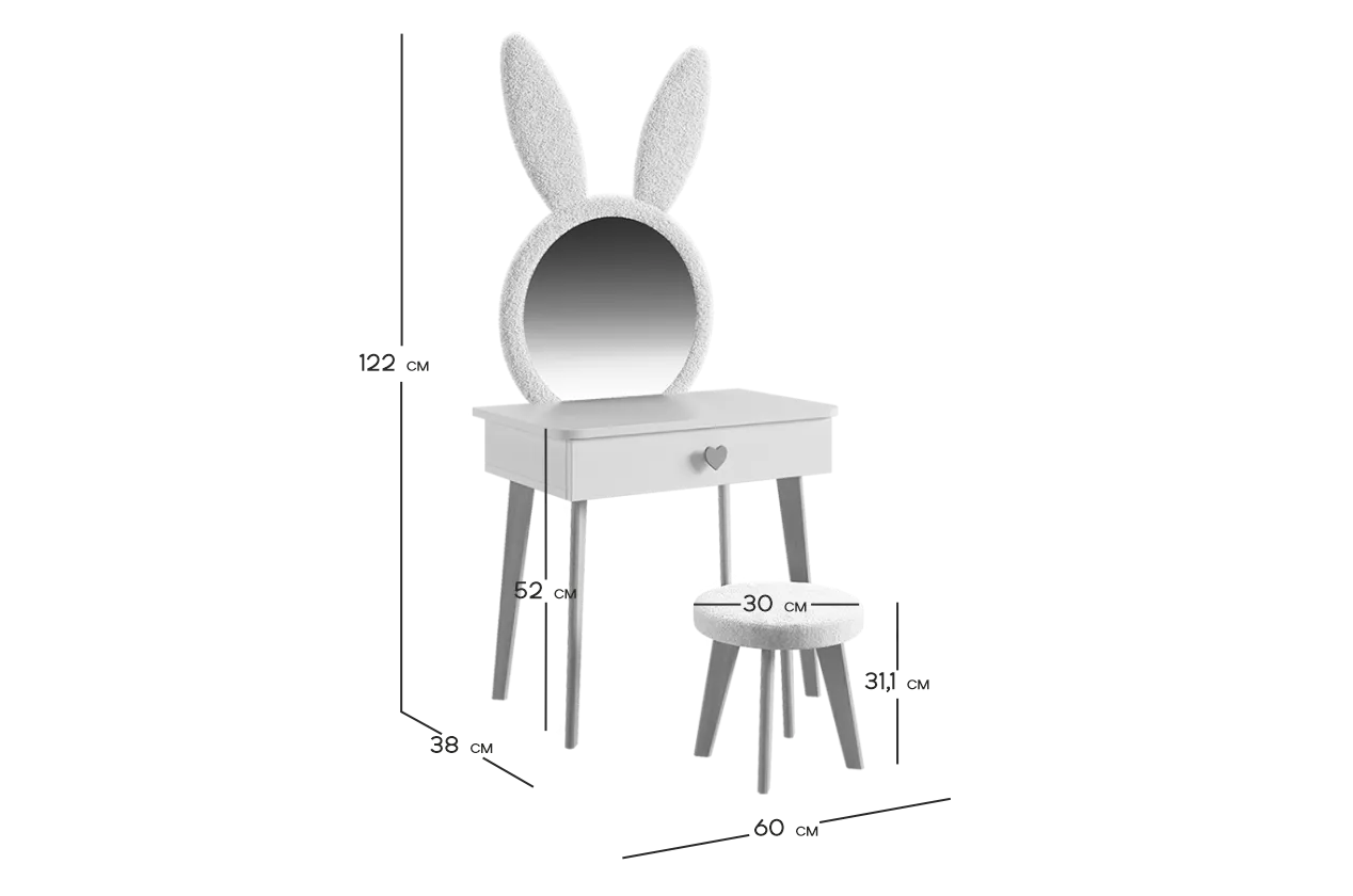 Этот набор непременно станет любимой мебелью для вашей дочери. Очаровательное зеркало украшено плюшевыми декоративными элементами, которые добавят в комнату тепла и уюта. Выдвижной ящик предоставляет просторное место для хранения детской косметики, украшений и многого другого. Прочные деревянные ножки трюмо и стульчика обеспечивают устойчивость и безопасность. Мягкий чехол на стульчике, создает комфорт при сидении.