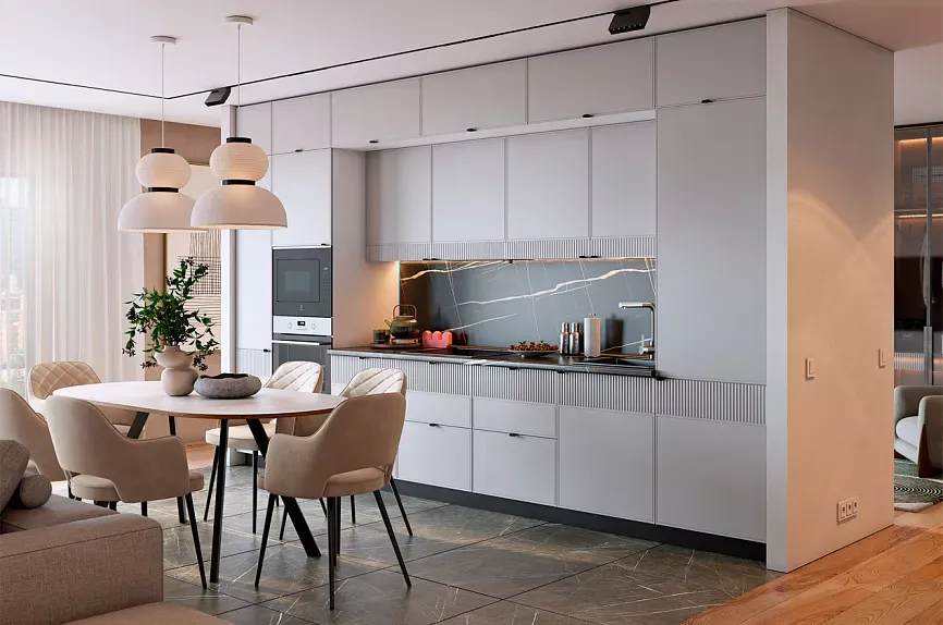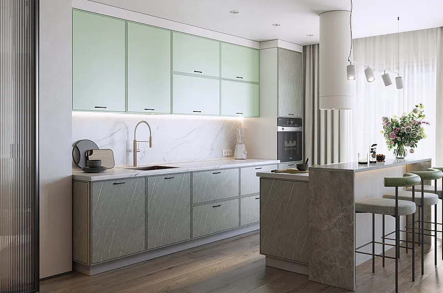 - Кухни с островом подходят для просторных помещений и станут центральным элементом интерьера, предоставляя дополнительную площадь для приготовления пищи и обеденную зону.