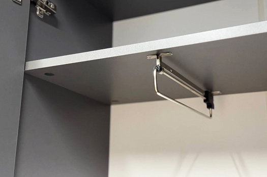 Шкаф оснащен накладными петлями с доводчиком от Боярд, которые обеспечивают плавное и бесшумное закрывание дверей. Выдвижная штанга предоставляет удобный доступ к одежде, позволяя легко организовать внутреннее пространство.