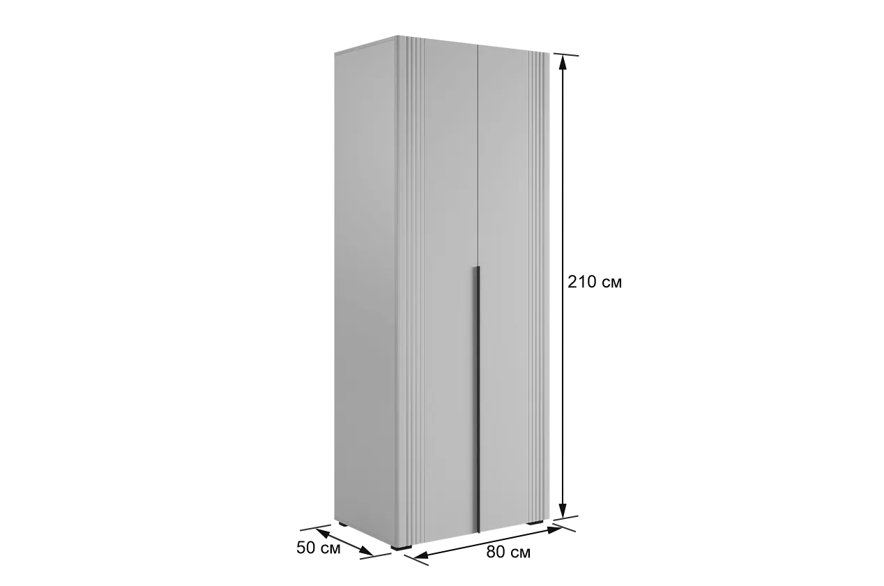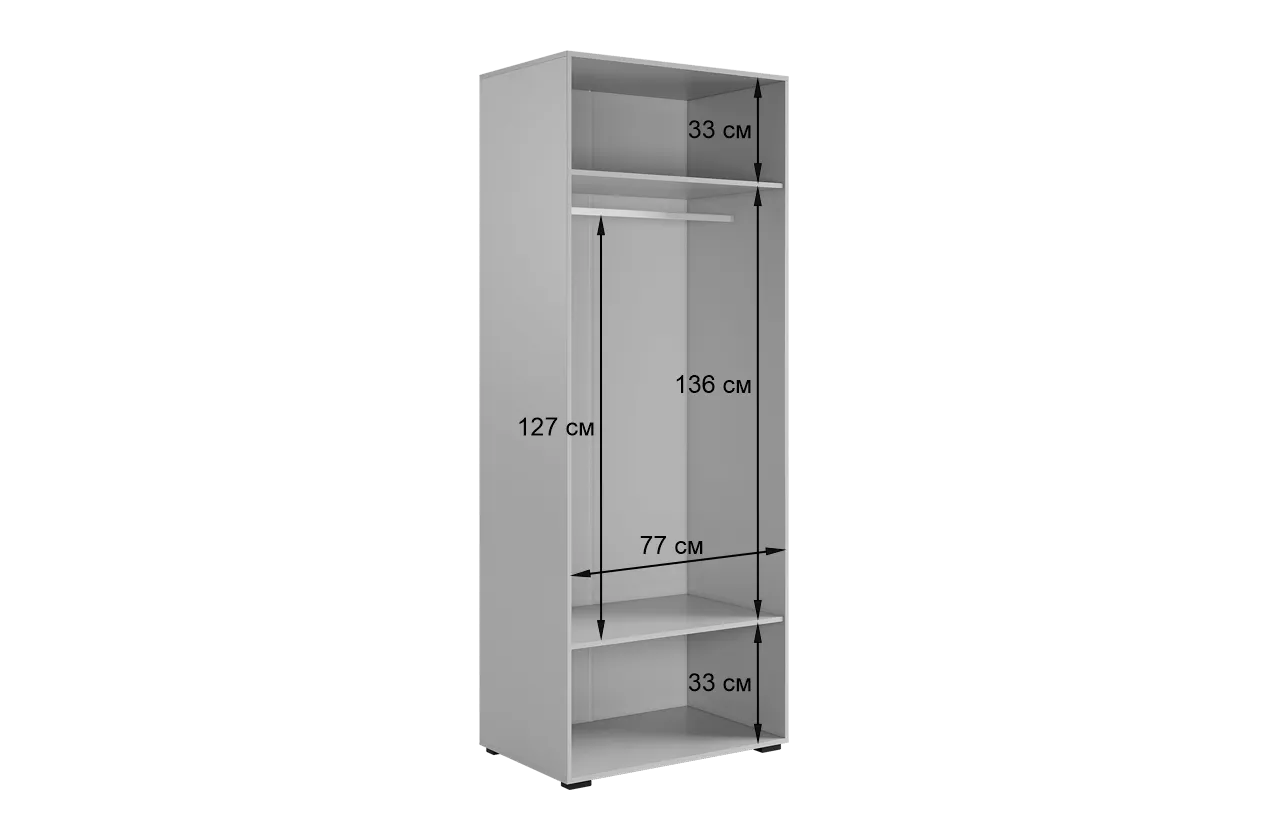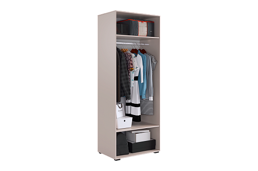 Шкаф оснащён длинными пластиковыми ручками и имеет удобное внутреннее наполнение: две большие полки и одна длинная штанга. Это позволяет рационально использовать пространство и разместить различные типы одежды.