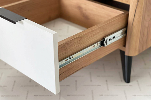 В выдвижном ящике на шариковых направляющих поместятся все необходимые вещи, а на открытой полке телефон, очки, книги и другие приятные мелочи.