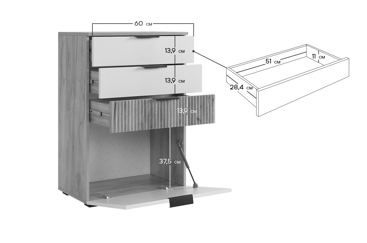 Комод "Бери"- это 3 вместительных ящика и откидная секция снизу, актуальное решение для гостиной, спальни, прихожей, детской и даже кабинета.