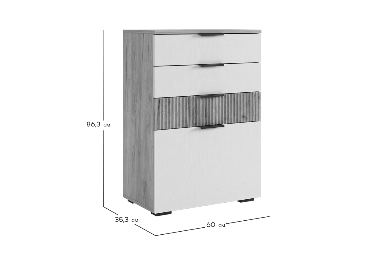 Акцентом в комоде будет МДФ фасад ящика с вертикальной фрезеровкой "Вельвет". Ящики возможно расположить в любой последовательности.