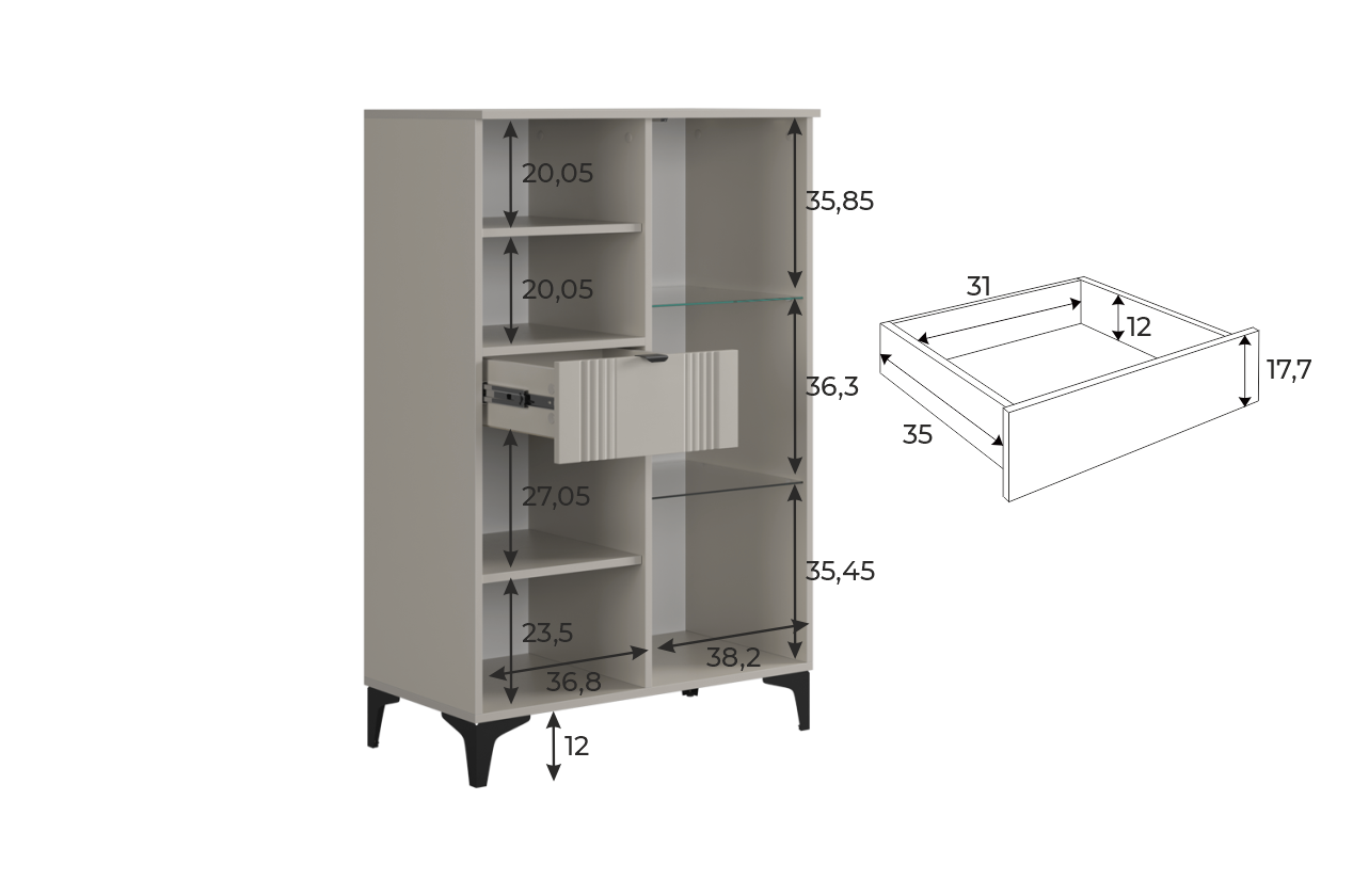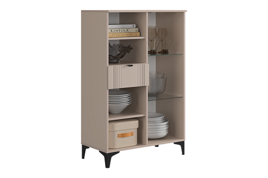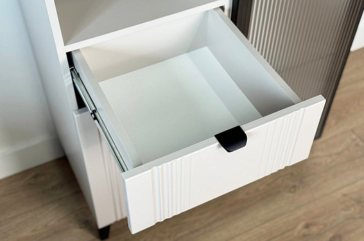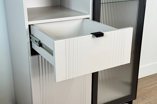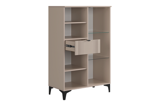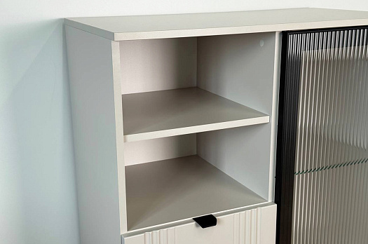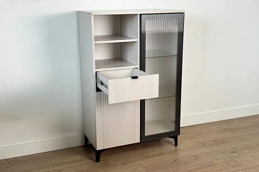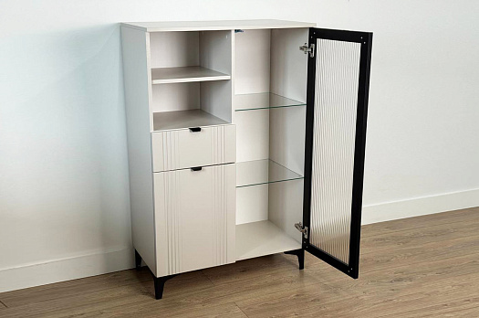 Дизайн комода продуман до мелочей: с одной стороны расположена стеклянная дверца, за которой находится просторное пространство для хранения. С другой стороны – ниша с открытой полкой, выкатной ящик и ещё одна глухая дверца, что позволяет гибко организовать хранение и поддерживать порядок в доме.