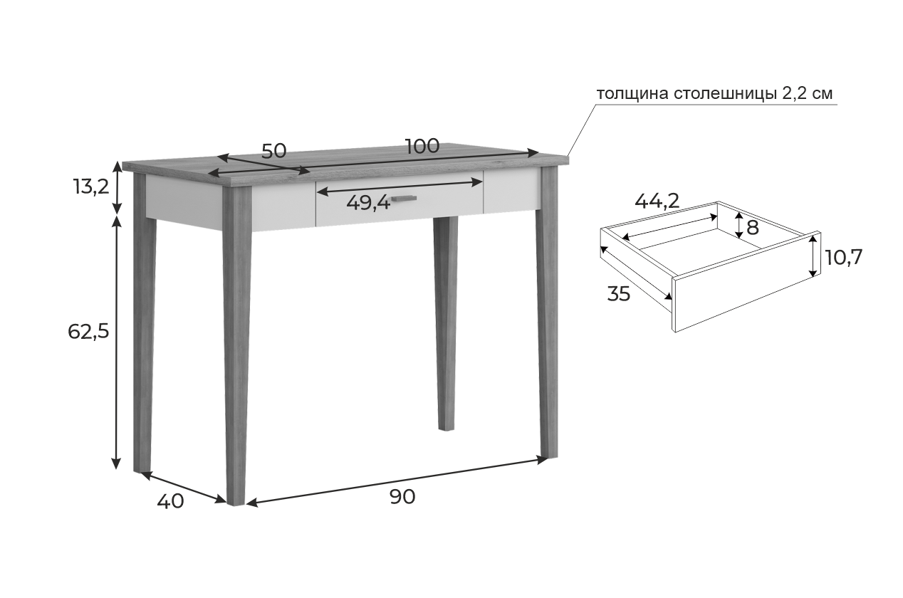 Корпус стола выполнен из ЛДСП в цвете белое дерево, что придаёт ему светлый и уютный вид. Усиленная столешница из ЛДСП толщиной 22 мм в цвете дуб крафт золотой обеспечивает прочность и создаёт изысканный акцент в интерьере.